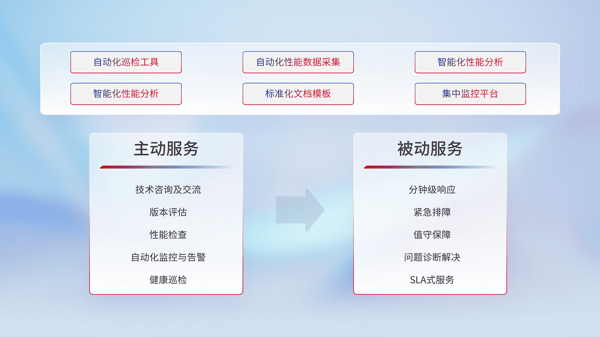 智能化工具和标准化文档,,,,保障服务质量,,,提供主动服务(包含技术咨询、、、版本评估、、、、性能检查、、、、自动化监控与告警、、、健康巡检)和被动服务包含(分钟级响应、、、紧急排障、、、值守保障、、、问题诊断解决、、、SLA服务)。。。
